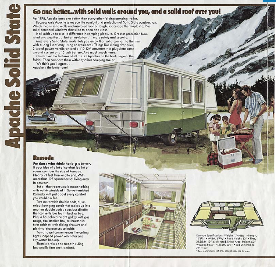 Apache produced eight different camper models in 1975. Those models are apple green. The Ramada is one of the largest models. It sleeps eight. At the time, the base price at one Illinois dealer was $3070. (Links to weights, pricing, and specifications can be found here.) It’s nearly 21 feet from end to end and has 127 sq ft of living area.